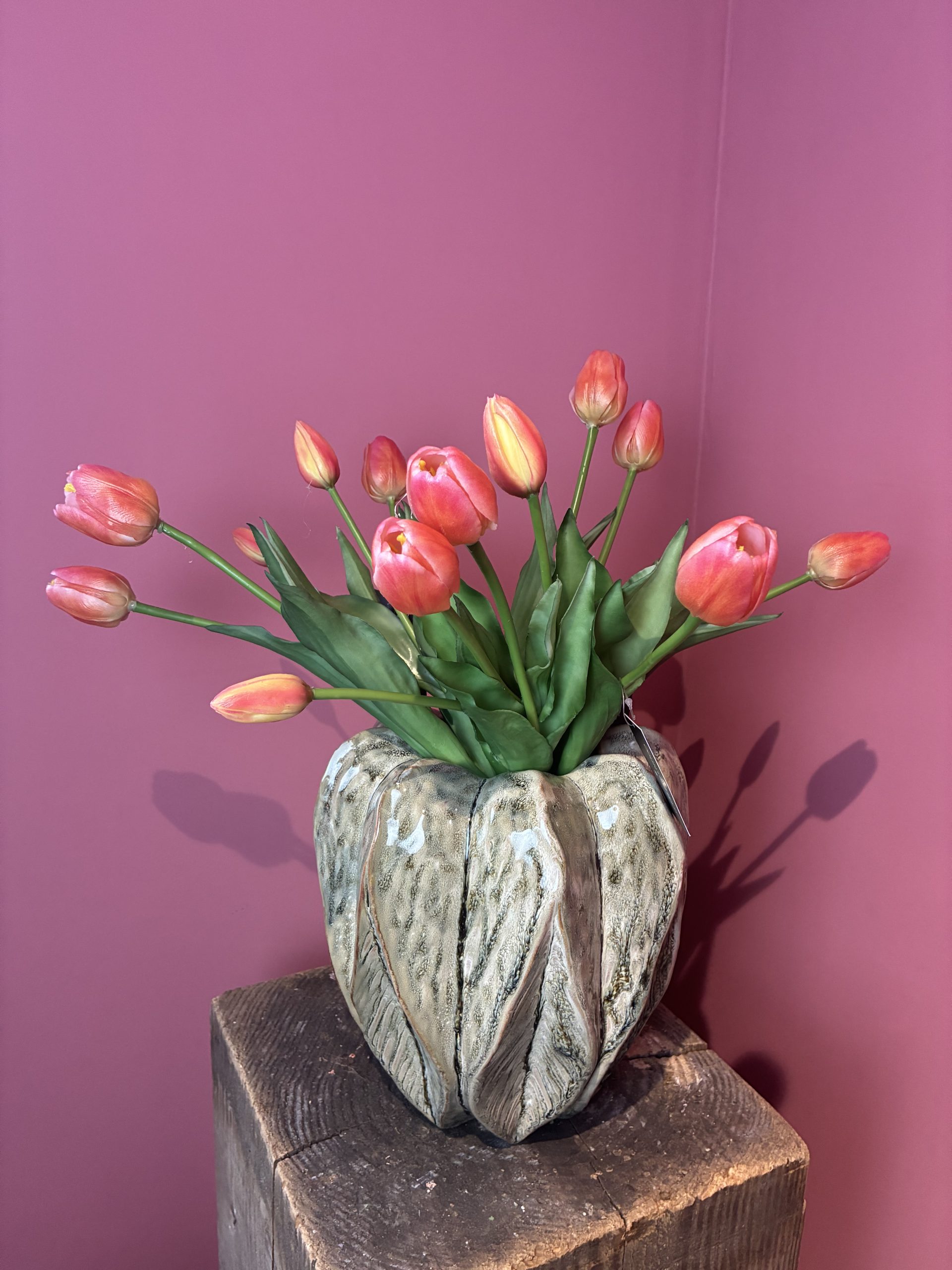 De tulpen zijn 40cm lang en doordat er ijzerdraad in de steel zit goed buigzaam.